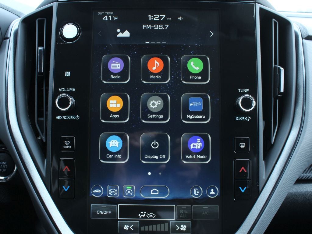 - Radio: Subaru 11.6" Multimedia Plus System -inc: AM/FM stereo, HD Radio, multi-touch gesture high resolution display screen, voice activated controls, Bluetooth® audio streaming and hands-free phone connectivity, Bluetooth® hands-free SMS text messaging connectivity, iPod control capability, smartphone integration: wired and wireless Android Auto w/full screen view and wireless Apple CarPlay w/full screen view, USB and Over The Air (OTA) audio system update, steering wheel audio system and Bluetooth® control switches, 6 speakers (2 dash panel tweeter, 2 front door and 2 rear door), illuminated 3.5mm auxiliary input jack, illuminated front USB A and C input/charge ports, connected services operation indicator, SOS emergency assistance: red SOS button and enhanced roadside assistance: blue i-button