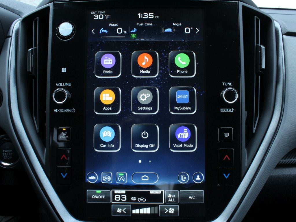 - Radio: Subaru 11.6" Multimedia Plus System -inc: AM/FM stereo, HD Radio, multi-touch gesture high resolution display screen, voice activated controls, Bluetooth® audio streaming and hands-free phone connectivity, Bluetooth® hands-free SMS text messaging connectivity, iPod control capability, smartphone integration: wired and wireless Android Auto w/full screen view and wireless Apple CarPlay w/full screen view, USB and Over The Air (OTA) audio system update, steering wheel audio system and Bluetooth® control switches, 6 speakers (2 dash panel tweeter, 2 front door and 2 rear door), illuminated 3.5mm auxiliary input jack, illuminated front USB A and C input/charge ports, connected services operation indicator, SOS emergency assistance: red SOS button and enhanced roadside assistance: blue i-button