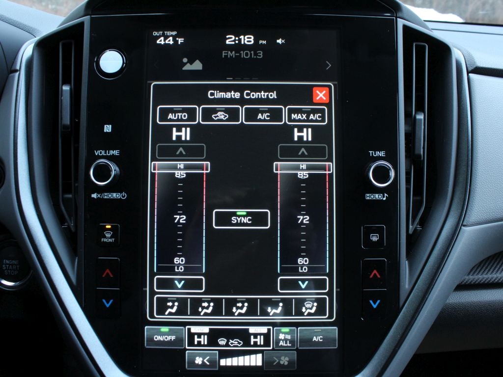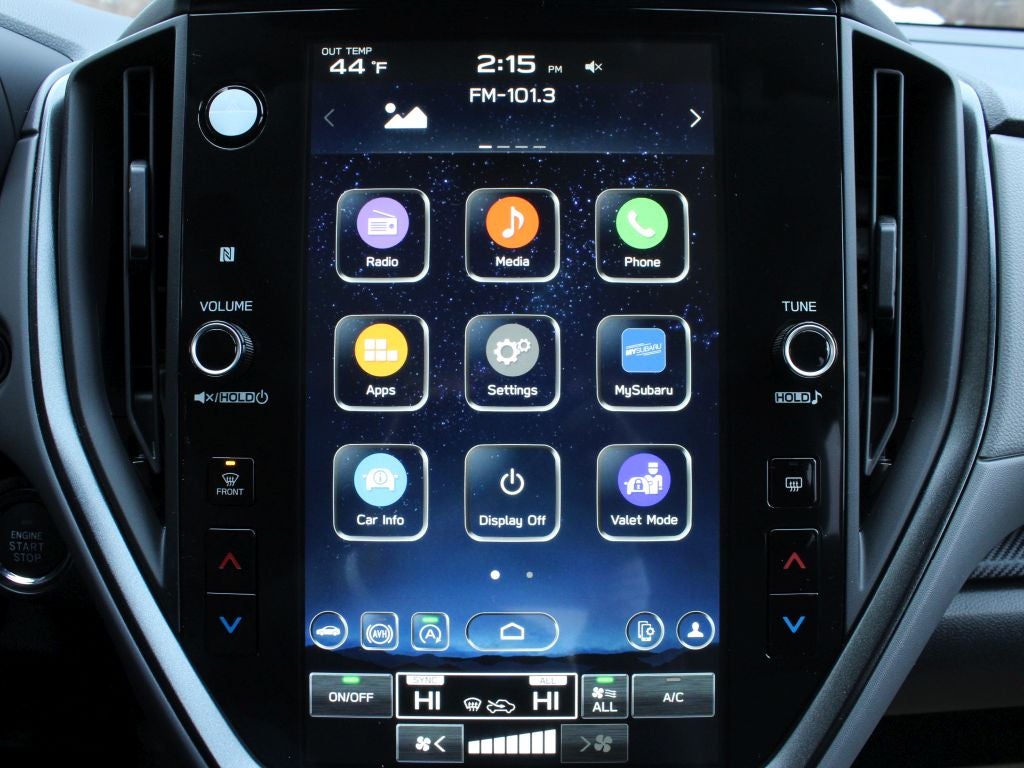 - Radio: Subaru 11.6" Multimedia Plus System -inc: AM/FM stereo, HD Radio, multi-touch gesture high resolution display screen, voice activated controls, Bluetooth® audio streaming and hands-free phone connectivity, Bluetooth® hands-free SMS text messaging connectivity, iPod control capability, smartphone integration: wired and wireless Android Auto w/full screen view and wireless Apple CarPlay w/full screen view, USB and Over The Air (OTA) audio system update, steering wheel audio system and Bluetooth® control switches, 6 speakers (2 dash panel tweeter, 2 front door and 2 rear door), illuminated 3.5mm auxiliary input jack, illuminated front USB A and C input/charge ports, connected services operation indicator, SOS emergency assistance: red SOS button and enhanced roadside assistance: blue i-button