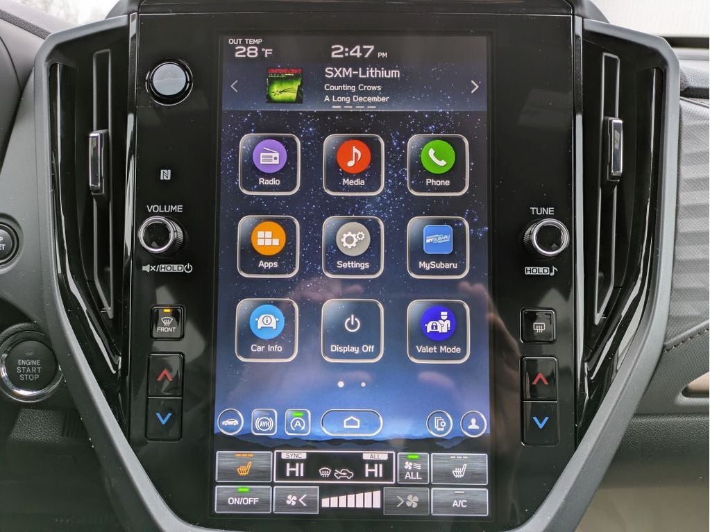 - Radio: Subaru 11.6" Multimedia Plus System -inc: valet mode, integrated center information display, AM/FM stereo HD Radio, multi-touch gesture high resolution display screen, voice activated controls, Bluetooth® audio streaming and hands-free phone connectivity w/SMS text messaging (refer to Subaru.com for cellphone compatibility), iPod control capability, smartphone integration: Android Auto and Apple CarPlay w/full screen view and wireless connection, SiriusXM satellite radio w/360L (free 4-month trial subscription included), USB and Over The Air (OTA) audio system update, steering wheel controls, 6 speakers, 3.5mm auxiliary input jack and roof mounted audio and satellite antenna