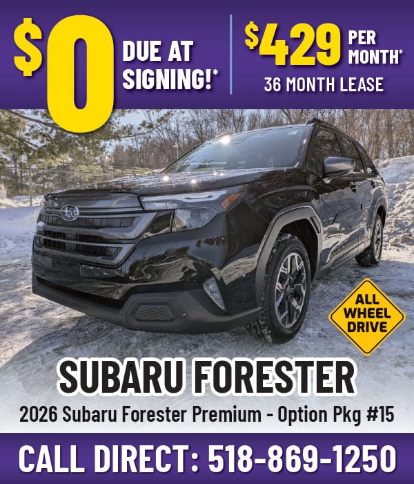 *Stk#S26F115, Model Code: TFD-15, MSRP: $37,396. Selling Price: $33,686.08 (Lease only), Residual value: $25,055.32, $429 per month, 36 months. 10,000 miles per year, 15 cents/mile overage. $0 due at signing. Payment Includes 1st Payment, 8% Sales Tax, Acq. Fee and NYS DMV/DOC fees. Valid on New In-Stock 2026 Forester Premiums with Option Package 15 only. Tier 1 credit, minimum FICO score of 700 to qualify. Photo for illustration purposes only. Subject to availability. Expires 4/30/26.