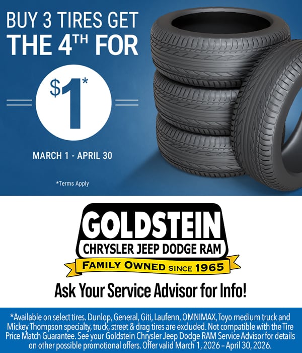 *Available on select tires. Dunlop, General, Giti, Laufenn, OMNIMAX, Toyo medium truck and Mickey Thompson specialty, truck, street & drag tires are excluded. Not compatible with the Tire Price Match Guarantee. See your Goldstein Chrysler Jeep Dodge RAM Service Advisor for details on other possible promotional offers. Offer valid March 1, 2026 – April 30, 2026.